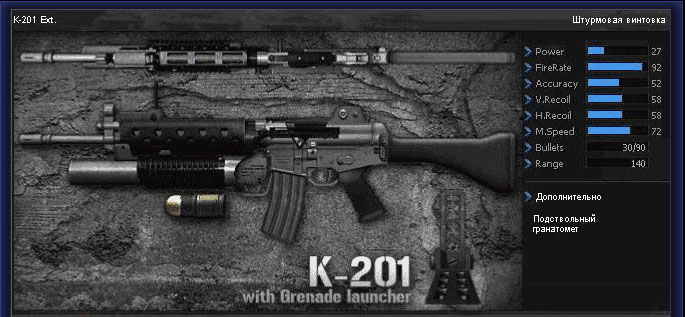 В реалиях Point Blank мы имеем модифицированную K-2 с подствольным гранатометом K-201 которая имеет все преимущества дефолтной версии - скорострельность, точность (которая теперь еще выше, реально стрелять на дальние дистанции), липнущие головошоты и лишена главного недостатка - непослушной отдаче но теперь винтовка стала тяжелее.